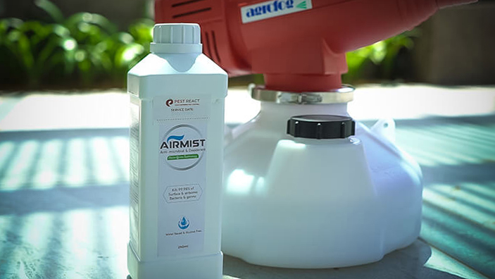 PEST REACT NANO COLLOIDAL SILVER- AIRMIST DISINFECTION, which is non-corrosive, water based, alcohol free, formulated with 100% natural based safer disinfection solution for the surfaces of your premises.